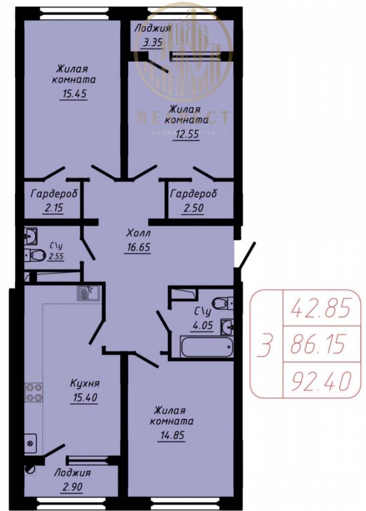 Продается 3-комнатная квартира в новостройке.
